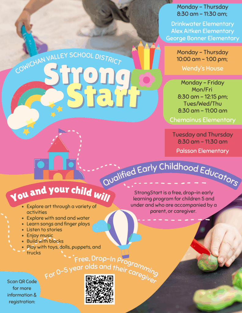StrongStart is a free, drop-in early learning program for children 5 and under and who are accompanied by a parent, or caregiver. Our StrongStart programs offer “Drop-in” visit systems for families!
